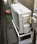 最新の室外機は一回り小さく、架台も新しく、転倒防止も付いてとっても安心ですね。